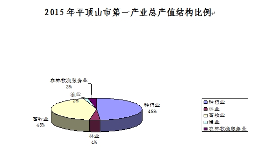 第一产业的发展优化主要依赖对土地资源、人力资源以及科学管理、新技术应用水平的改善状况。平顶山市土地构成比例平原:丘陵:山区为1:2.62:0.54,分别占土地总面积的24%、63%、13%。全省土地构成比例平原:丘陵:山区为1:0.3:0.5,分别占土地总面积的55.7%、17.7%、26.6%。2015年,全市第一产业总产值 308.67亿元,占全国的0.5%,占全省的4.0%,总量是2005年的2.3倍,按可比价计算年均增长8.6%。2015年种植业总产值150.4亿元,占第一产业总产值的48.7%,比2005年上升3.2个百分点;林业总产值11.32亿元,占第一产业总产值的3.7%,比2005年上升0.7个百分点;畜牧业总产值132.35亿元,占第一产业总产值的42.9%,比2005年下降6.6个百分点;渔业和农林牧渔服务业总产值14.6亿元,占第一产业总产值的4.7%,比2005年上升2.8个百分点。全市2015年第一产业总产值的结构分别为48.7%、3.7%、42.9%、1.6%、3.1%。