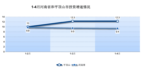 固定资产投资平稳增长。1-4月,全市固定资产投资同比增长12.2%(含汝州增长12.3%),较上年同期下降2.5个百分点,增速与上月持平,分别高于全国、全省投资平均增速5.2个百分点和2.8个百分点,增速列全省第2位,与上月排名位次持平。